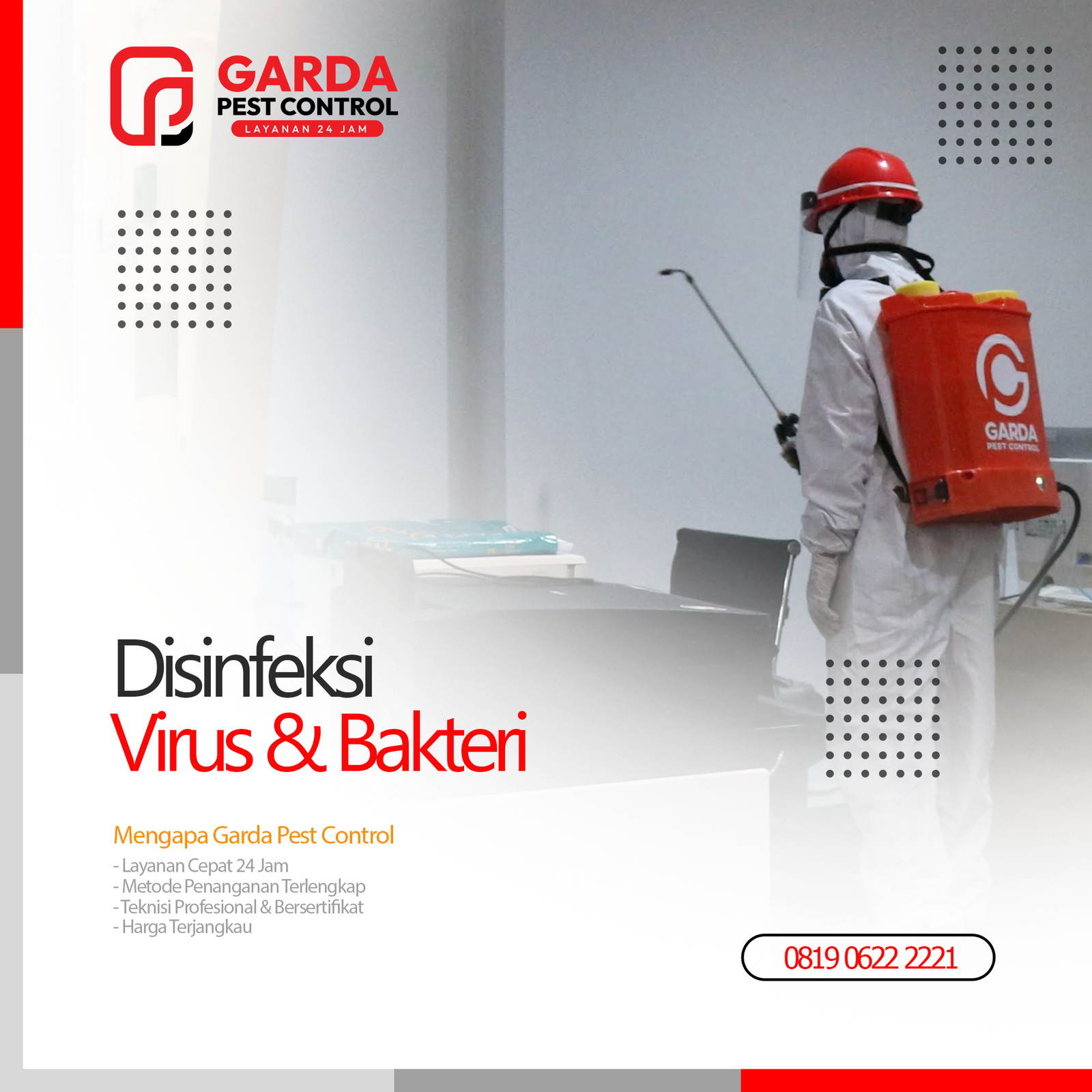 - Efektivitas Tinggi: Disinfektan yang kami gunakan terbukti ampuh membunuh berbagai jenis virus, termasuk virus penyebab penyakit menular.